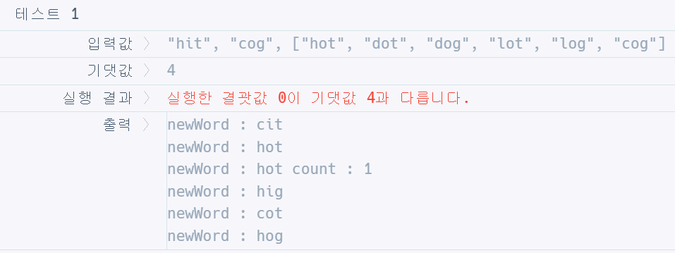 "hit" -> "hot" -> "dot" -> "dog" -> "cog" 처럼 dog 등으로 우회할 수 있어야하는데 이부분을 고려못함