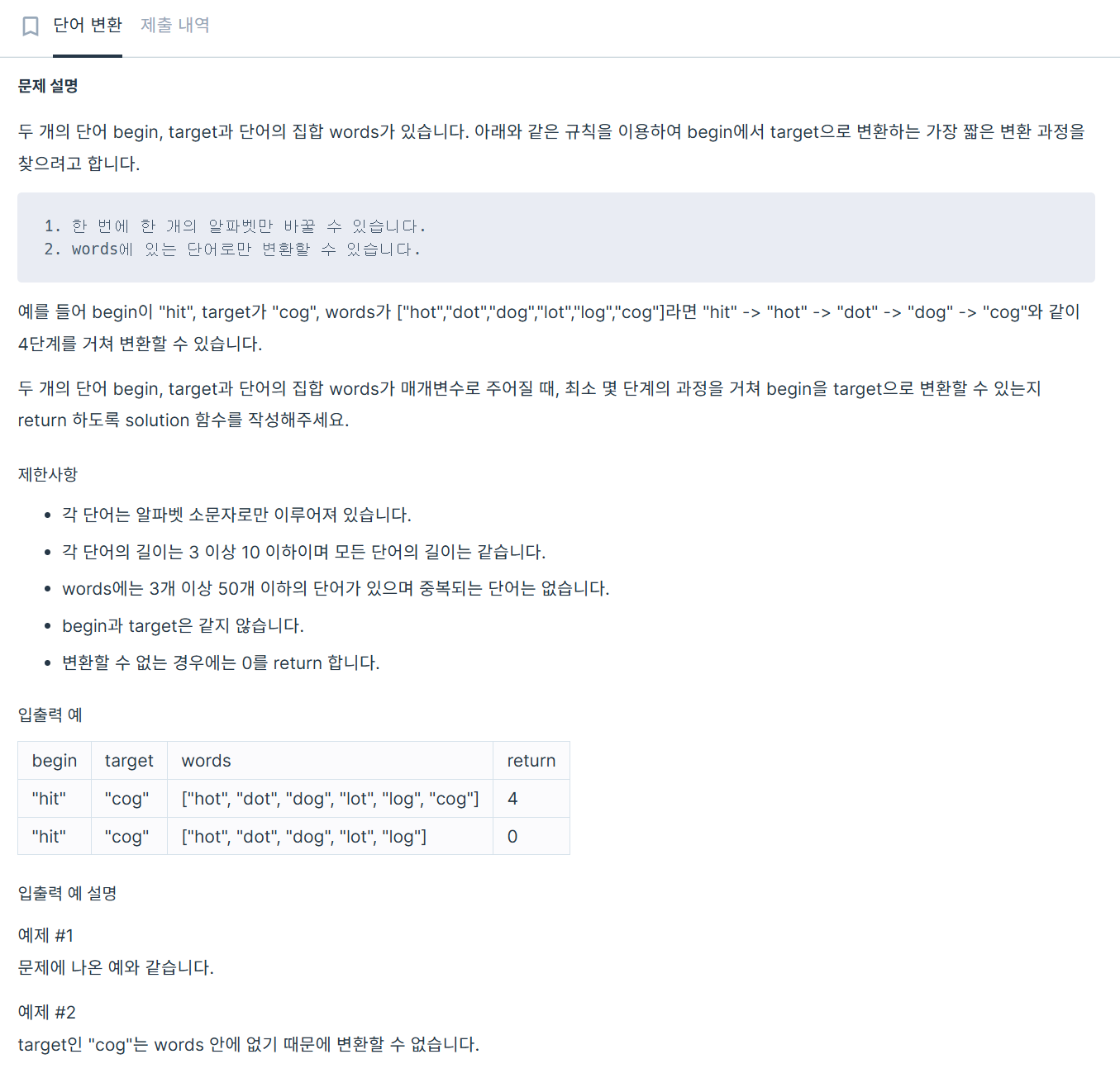 - 복잡한 조건 판별은 별도의 함수로 분리하는 것이 좋습니다. 두 단어가 한 글자만 다른지 확인하는 로직을 별도 함수로 만들면, 메인 로직이 간결해지고 가독성이 높아져 실수를 줄일 수 있습니다.
