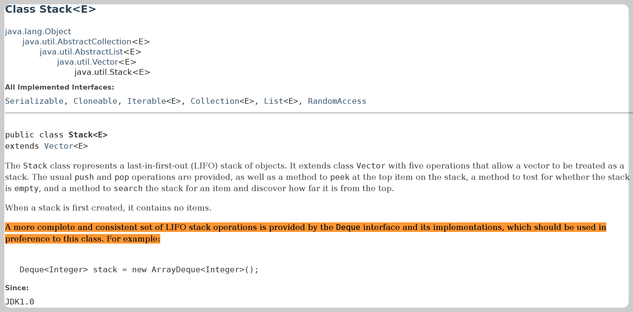 더 완전하고 일관된 LIFO(후입선출) 스택 연산 집합은 Deque 인터페이스와 그 구현체에서 제공되며, 이 클래스보다 Deque를 사용하는 것이 권장됩니다.