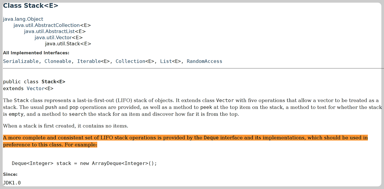 4️⃣또한 java 공식 문서에서도 Stack 보다 Deque로 구현할 것을 권장하고 있다