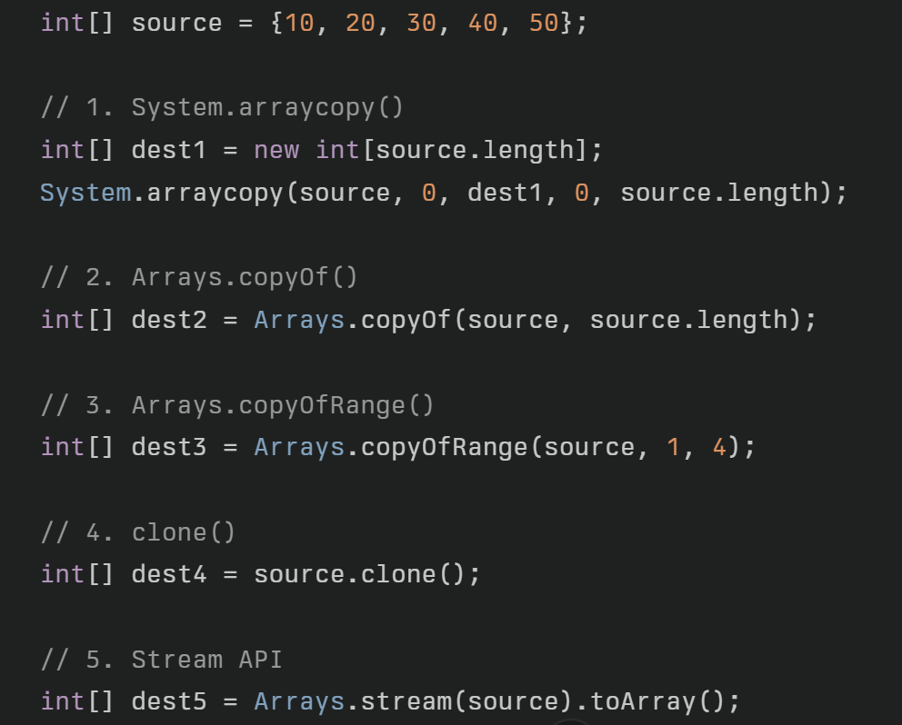 Java에서 배열을 복사하는 주요 메서드들을 간단히 정리하면 다음과 같습니다.