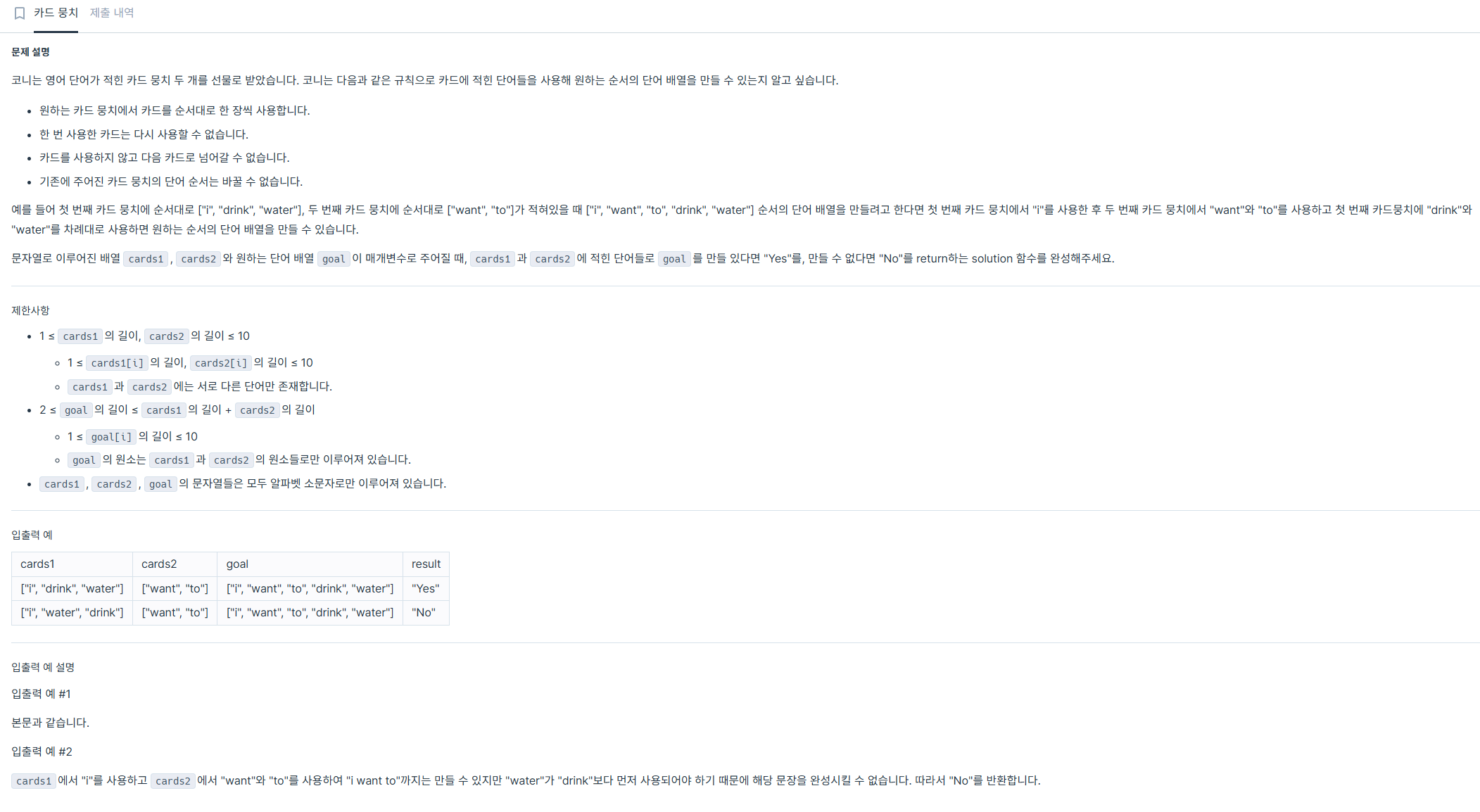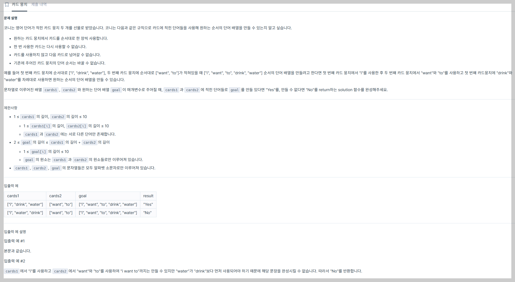 public String solution(String[] cards1, String[] cards2, String[] goal) {