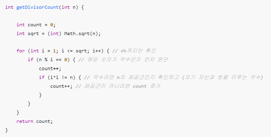 💡풀이import java.util.ArrayList;import java.util.List;class Solution { public int solution(int[] nums) { int count = 0; for (int a = 0; a 📖새로 배운 부분- 약수의 개수를 구하는 효율적인 알고리즘 정리 글 [Java] 약수의 개