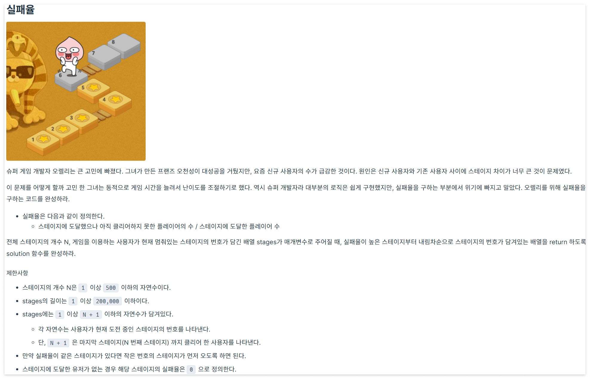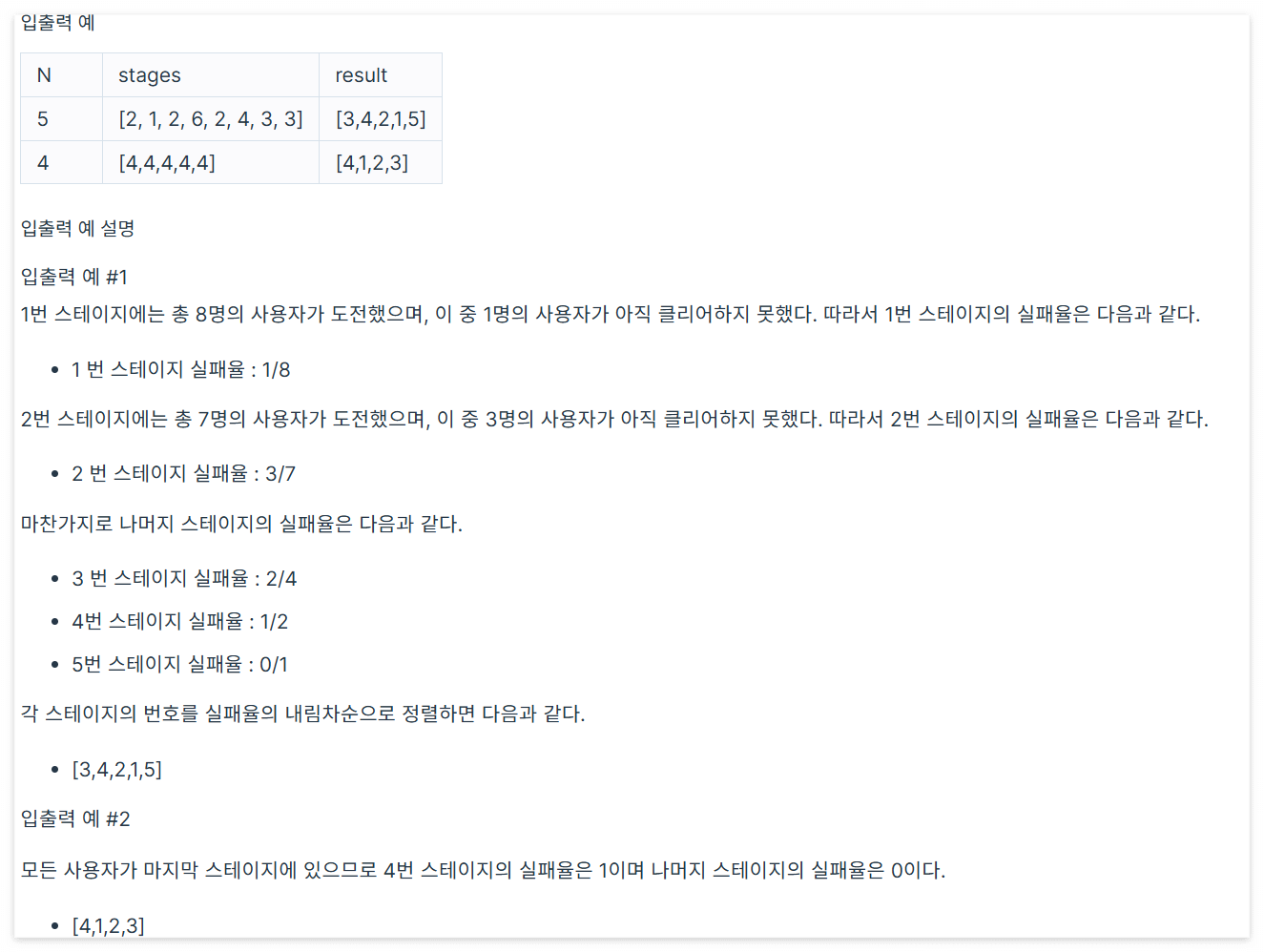 Map<Integer, Double> fails = new HashMap<>(); // 각 스테이지에서 실패한 사람 수