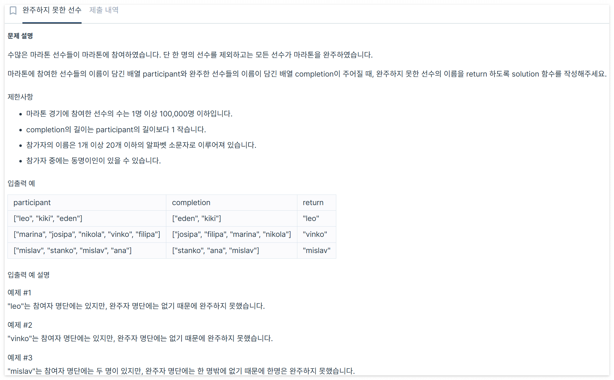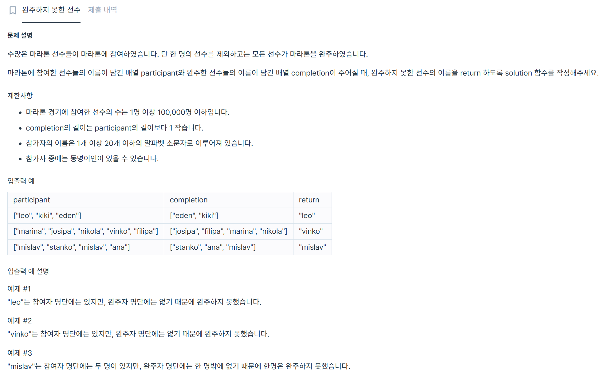 return ""; // 반복문을 통해 미완주자를 못찾는 경우는 존재하지 않음
